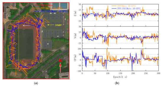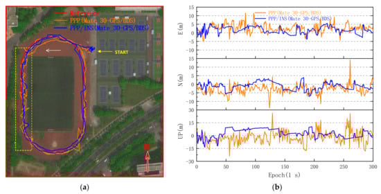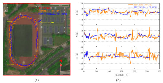 Compared with Figure 12a, the offset of trajectory was significantly improved in Figure 13a. In Table 2, the RMS of Mate 30 GPS/BDS PPP/INS horizontal errors decreases by 33.24% from 5.367 to 3.583 m, and the maximum horizontal positioning error decreases from 15.041 to 7.294 m. The RMS of Mate 30 GPS/BDS PPP/INS vertical errors decreases by 24.64% from 7.359 to 5.546 m. Previously, the average C/N0 value observed on the west side of the playground was significantly lower than that on the east side, as shown in Figure 4a. Comparing the PPP solutions on the west and east sides of the playground, the RMS of Mate 30 GPS/BDS PPP horizontal errors on the west side is 6.515 m, which is 27.17% higher than the 5.123 m on the east side.