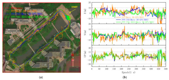 However, based on the INS-aided and RKF parameter estimation model, the RMS of Mate 30 GPS/BDS positioning horizontal errors on the west side of the playground decreases by 41.21% to 3.830 m, and the RMS of Mate 30 GPS/BDS positioning horizontal errors on the east side of the playground can reach 3.073 m. Subsequently, the IMU data of ADIS16405 were used with Huawei Mate 30 in the experiment on the sidewalk, and the GNSS PPP and PPP/INS solutions are shown in Figure 14.