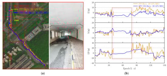 Considering that few GNSS satellites signals can be observed by smartphones in some areas such as tunnels, the solutions of the current epoch would be output by INS when the number of satellites could not meet the requirements of GNSS positioning, and other parameters, such as ambiguity, are usually initialized at the beginning, which are the same as before. As shown in Figure 15a, the experiment was conducted in a tunnel shown on the right with a length of about 80 m, and the vertical drop is more than 10 m. The trajectories of Mate 30 GPS/BDS PPP and PPP/INS solutions are shown on the left, and the gaps between the positioning points are preserved in the trajectory.