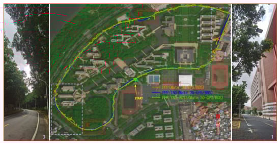 In fact, the GNSS satellite signals were blocked gradually before the smartphone entered the tunnel, the PDOP value of GNSS satellites increased gradually, and the horizontal and vertical errors were shown to fluctuate significantly for 25 to 40 epochs in Figure 15b. From 41 to 77 epochs, the number of GNSS satellites observed by Mate 30 was insufficient to meet the requirement of the PPP method. Nevertheless, the position of the smartphone can still be obtained continuously with the PPP/INS coupled method while inside the tunnel, and the horizontal deviation from the reference point is more than 8 m at 29 epochs. Then, the positioning points of PPP/INS gradually approach the reference trajectory after leaving the tunnel. The RMS of horizontal deviation in the tunnel is 6.700 m, and the maximum horizontal and vertical deviation are 8.139 and 7.996 m, respectively. Compared with the RMS of PPP/INS horizontal errors from 1 to 40 epochs, the RMS of PPP/INS horizontal errors in the tunnel increases only 21.99%. Meanwhile, it should be noted that the deviation will increase significantly with the further increase of the length of tunnel. Finally, a long trajectory experiment with PPP, PPP/INS, and PPP/INS–ADIS was conducted, and the trajectories are shown in Figure 16.