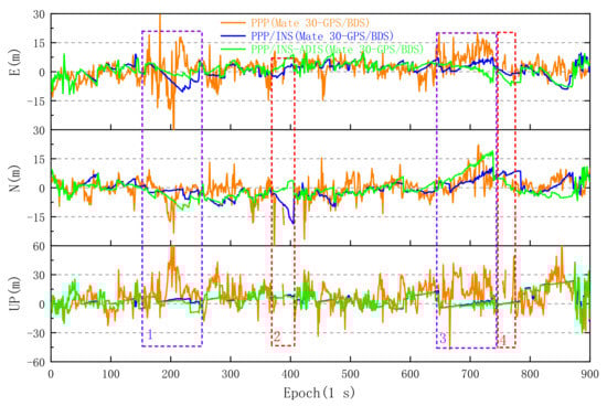 As shown in Table 4, compared with PPP solutions, the RMS of PPP/INS horizontal errors in the area marked by purple box 1 decreases by 49.37% from 11.419 to 5.782 m, and the RMS of PPP/INS horizontal errors in the area marked by purple box 3 decreases by 48.29% from 11.618 to 6.008 m. Meanwhile, the RMS of PPP/INS vertical errors also decreases significantly. In the area marked by red box 2, as shown in Figure 16, the deviations on the south direction between the trajectories of PPP/INS and reference increased rapidly after the GNSS signals were blocked, which can be caused by the scarcity of GNSS satellites before. Meanwhile, it can be found that the southward error of PPP is higher than 30 m in 373 epochs, as shown in Figure 17. However, compared with the trajectory of PPP/INS, the deviations of trajectory between PPP/INS–ADIS and reference are lower. In the area marked by red box 4, the deviations of trajectory of PPP/INS are approximate to those of PPP/INS–ADIS. For the long trajectory experiment, the RMS of PPP/INS and PPP/INS–ADIS horizontal errors are 6.01 and 5.73 m, respectively, which are significantly lower than those of conventional PPP.