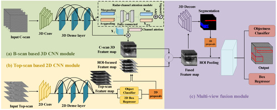 Figure 5. This network consists of three modules: (a) B-scan based 3D CNN module: a 3D CNN is designed to extract the 3D feature map from C-scan data. (b) Top-scan based 2D CNN module: It generates ROI-focused (Region of Interest) features via projecting 2D proposals to the 2D feature map extracted from Top-scan data. (c) Multi-view fusion network: a fusion network is used to combine multi-view features via region alignment, and to jointly predict object classification and 3D bounding box regression.