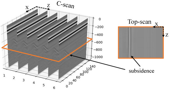 Figure 10d–f, all buried objects are displayed in B-scan images as hyperbola. This proves that our experimental setup is effective, and the simulation data of different shapes of subsurface diseases are successfully collected. Then, we generate the C-scan data and Top-scan images by combining simultaneous B-scan images. For example, the Top-scan image of a subsidence defect is produced as shown in