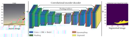 On the other hand, the SegNet architecture [36] FCN is based on decoupled encoder–decoder, where the encoder network is based on convolutional layers, while the decoder is based on up-samples. The architecture of this model is shown in Figure 7. It is a symmetric network where each layer of encoder has a corresponding layer in the decoder.
