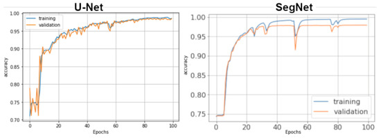 Figure 11 shows a trend graph of the accuracy metric (Y axis) over the number of epochs (X axis) for the training (blue) and validation (orange) datasets. In the Epoch 100, the accuracy value reached for the U-Net architecture training dataset is 98.35% and validation dataset is 98.28; while, for SegNet, the accuracy value for the training dataset is 98.15% and validation dataset is 97.56.