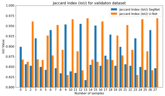 IoU (Intersection over Union) or Jaccard index is the most commonly used metric to evaluate models of semantic segmentation. It is a straightforward metric but extremely effective (metric ranges from 0 to 1, where 1 is the perfect IoU). Thus, in order to quantify the results, for both architectures, the IoUs were calculated using the validation dataset with 112 images with a step of 28 per epoch that represent 20% of the whole dataset. An average of IoU of 0.9013 was obtained for U-Net architecture and, for SegNet, an average value of IoU of 0.88 (Figure 12).