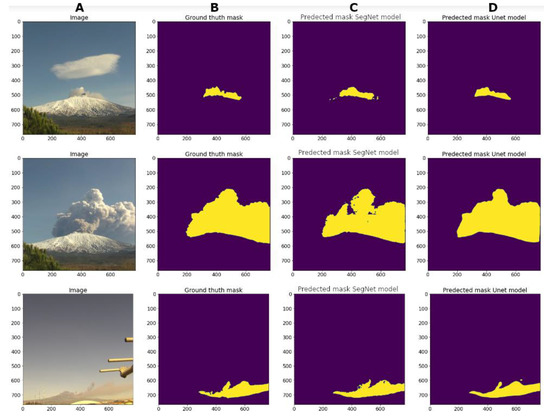 Segmentation is a fundamental task for image analysis. Semantic segmentation describes the process of associating each pixel in an image with a class label. Segmenting images of volcanic plumes is a complicated task, different from segmenting other objects, such as people, cars, roads, buildings, and other entities that are well differentiated from their background. Those types of objects are considered homogeneous and regular in form and radiometry, but a volcanic plume can have very different physical properties [32], such as shapes, colour, and density. In deep learning, CNN appears as a class of ANN based on the shared-weight architecture of the convolution kernels [11] and proved very efficient for pattern recognition, feature extraction for applications in computer vision analysis and image recognition [33], classification [34], and segmentation [35]. This is useful to solve problems as faced in this paper. Thus, this paper presents developed models based on specific CNN architectures.