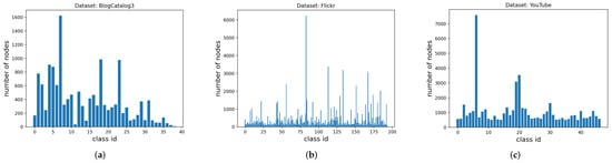 Label distribution of three real-world multi-label network datasets: (a) BlogCatalog3 [], (b) Flickr [], and (c) YouTube []. The horizontal axis represents the label id, and the vertical axis represents the number of nodes containing each label. It can be clearly observed that these label distributions are all highly imbalanced, where a few classes contain many more nodes than the rest of the classes.