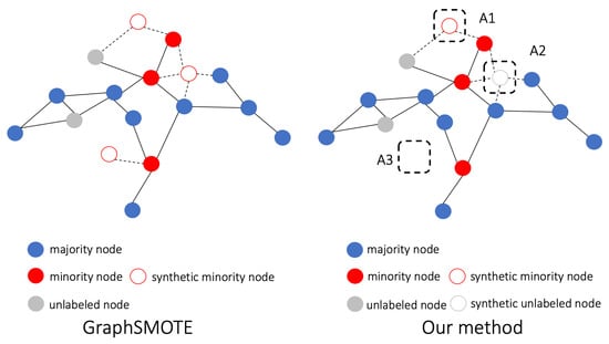 A comparison between our method and the current state-of-the-art graph over-sampling method GraphSMOTE []. In the current method, the idea is to generate new minority instances near randomly selected minority nodes and create virtual edges (dotted lines in the figure) between those synthetic nodes and real nodes. Instead, we synthesize minority instances in safe areas (i.e., A1), generate unlabeled instances in locally balanced areas (i.e., A2), and do not conduct data over-sampling near minority nodes that are outliers (i.e., A3). For the simplicity of illustration, only a single-label scenario is shown.