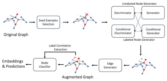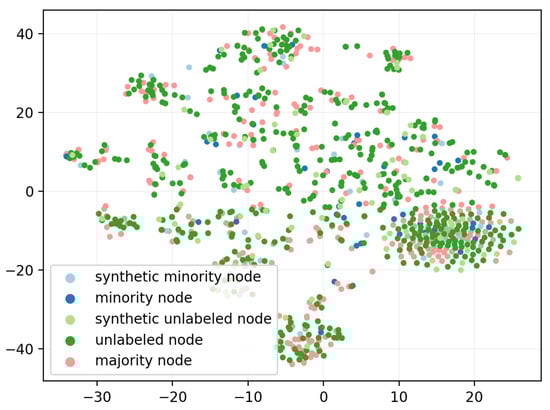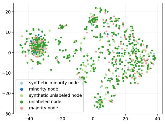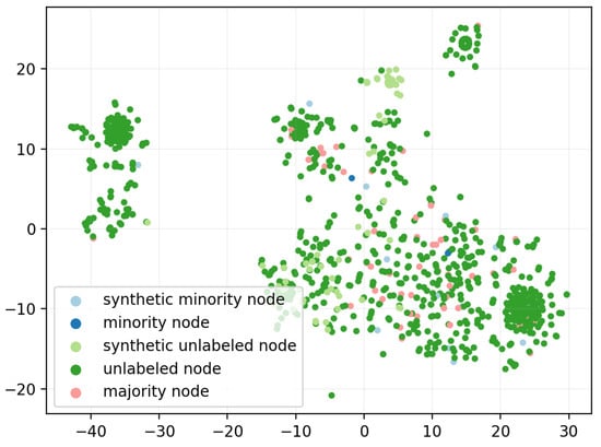 The focus of this study is to investigate solutions for semi-supervised GRL and graph node classification on imbalanced multi-label graphs. The most closely related works can be found in the emerging area of imbalanced graph node classification [,,]. Among these works, the dual-regularized graph convolutional network (DR-GCN) [] model relies on a class-conditioned adversarial training process to facilitate the separation of labeled nodes and the identification of minority class nodes. GraphSMOTE [] attempts to transfer the classical SMOTE method [], which deals with imbalanced data, to graph data. In addition, the relaxed GCN network (RECT) [] has reported the best performance on imbalanced graph node classification tasks, and its core idea is based on the design and optimization of a class-semantic-related objective function. Unlike GraphSMOTE, which is based on labeled minority generation, we present the first graph node over-sampling model that utilizes synthetic unlabeled nodes to inhibit the tendency of GNNs to overfit to majority under the topological effect. The new supervision information resulting from labeled synthetics and the blocking of over-propagated majority features by unlabeled synthetics facilitates balanced learning between different classes, taking advantage of the strong topological interdependence between nodes on a graph. We specify the details of the proposed model in the next section.