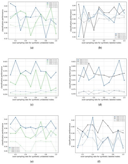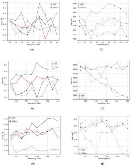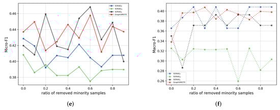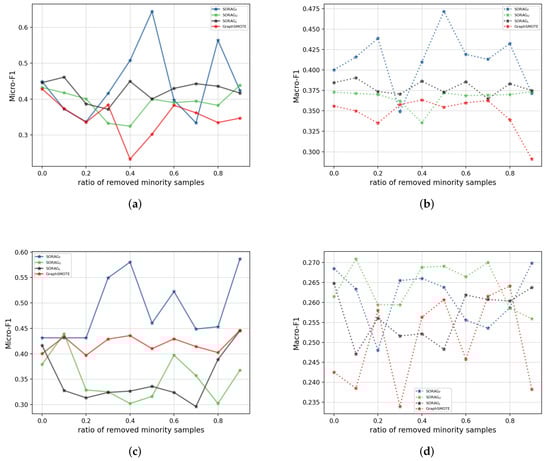 In this section, we exhibit the performance of SORAG on a standard geographic knowledge graph named US-Airport as an example of the application of our approach in the field of remote sensing, as geographic knowledge graphs are reported to play an increasing role in the computation, analysis, and visualization of large-scale remote sensing data []. US-Airport is the dataset used in struc2vec [] (https://pytorch-geometric.readthedocs.io/en/latest/modules/datasets.html (accessed on 25 June 2022)), where nodes denote airports and labels correspond to activity levels. One-hot encodings were used as features. We randomly selected 20% of all nodes as the test set and 80% as the training set. Additionally, the average results from 10 separate experiments were used. Table 6 shows the performance of the analyzed methods in terms of Micro-F1 and Macro-F1. As shown, the performance gain from the state-of-the-art method GraphSMOTE towards SORAG is considerable, which demonstrates our data over-sampling strategy is able to weaken the drawbacks of the imbalanced node distribution.