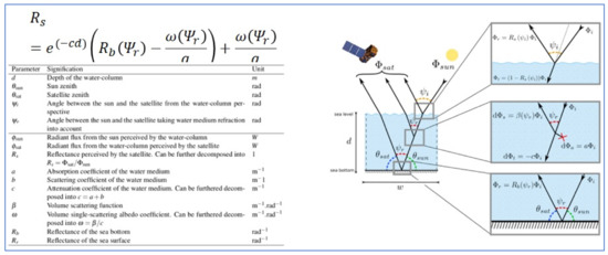 - The second problem: when trying to retrieve depths, several a priori are required because the equation is severely underdetermined and unresolved members must be parameterised. Some of those parameters are very difficult to obtain, e.g., attenuation coefficients, seafloor reflectances).