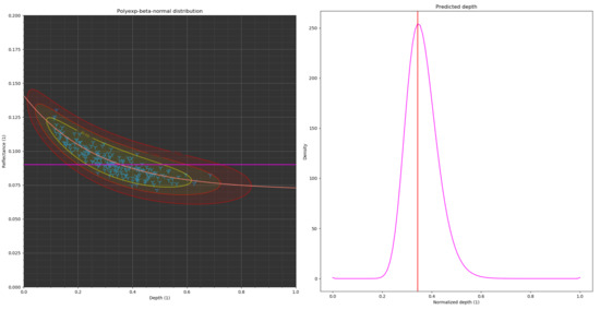 Instead of restricting the main equation and its domain (by fixing some arbitrary parameters or supposing a correlation between them), some statistical parameters are judiciously added to increase flexibility and ease of use in the context of noisy measurements. In WCPE, the main objects used when building a bathymetry model are probabilistic distributions with support in the depth-reflectance(s) space, centred around curves derived from Lyzenga’s equations. Those distributions are given substance (a probabilistic hull) in this space thanks to a dispersion parameter accounting for noise on reflectance values, as well as a variable following a beta distribution constraining the domain of validity of the object over an arbitrary range of depths. From here onward, such distributions will be referred to as Beta-Normal-Polynomial-Exponential distributions, or BNPs for convenience’s sake.