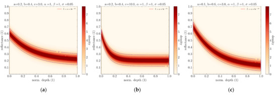 Influence of parameters a, b, and c from Lyzenga’s equation. (a) Simple instance of BNP. (b) Same BNP with higher attenuation coefficient c. (c) Same BNP but with different parameters a and b.
