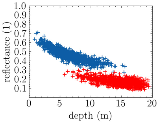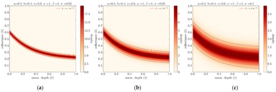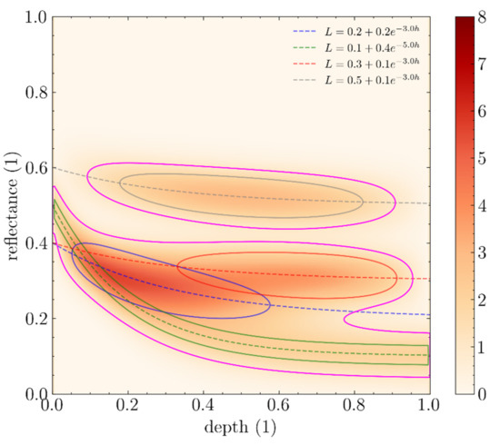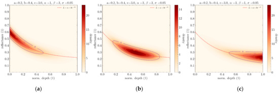 , and refer to the parameters of the simplified Lyzenga’s Equation (2), α and β scalars correspond to the parameters of the underlying beta distribution, and σ is a scalar that corresponds to a dispersion parameter along the axis of reflectances. In the case of a single spectrum being used, this distribution has support in the space of the product of depths by reflectances, [0, 1] × [0, 1]. Its probability density function (PDF) is defined as follows: