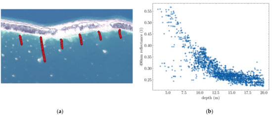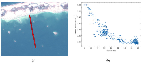 Ground truth provided by a single sounding line in Tahanea. (a) World View image and supporting ENC cross-section in red. (b) Scatter plot of blue Depth/Reflectance data.
