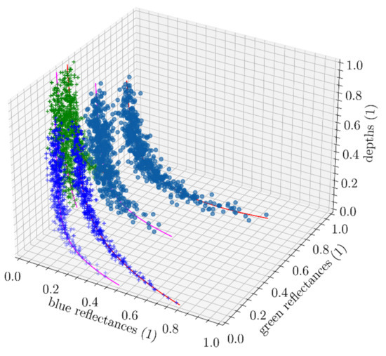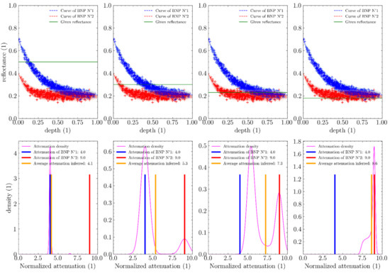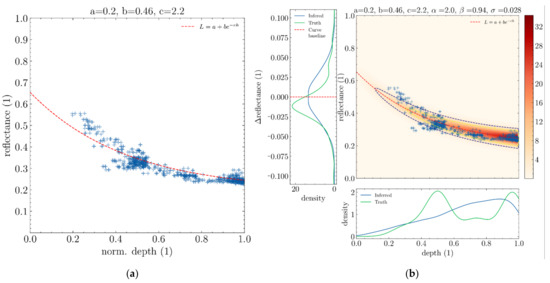 Figure 13 shows that curves from Lyzenga’s equation emerge naturally from simple data samples. Here, this dataset presumably contains only one water- profile which makes the curve quite apparent. Because real in situ data samples do not perfectly follow those equations and are affected by noise, adding a dispersion parameter makes sense. The addition of this dispersion parameter means that instead of studying mere curves we study densities in the depth-reflectance space. In the case of BNP distributions, the dispersion of the reflectance of samples relative to the curve was supposed to follow a normal distribution because it is the standard distribution adopted when modelling unspecific noises.