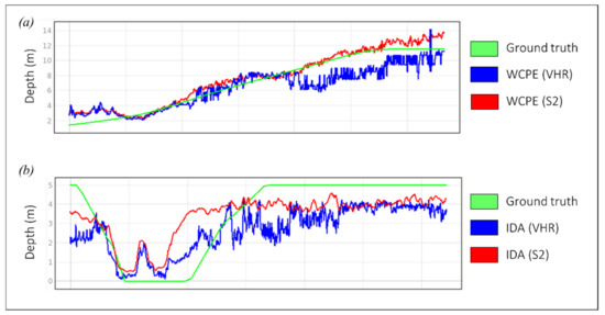 Typical cross sections comparing methods and satellite images of different resolutions. (a) VHR best single image vs Sentinel-2 time series modellised with WCPE, (b) The same, modellised with traditional SDB. Note the VHR poor signal/noise ratio.