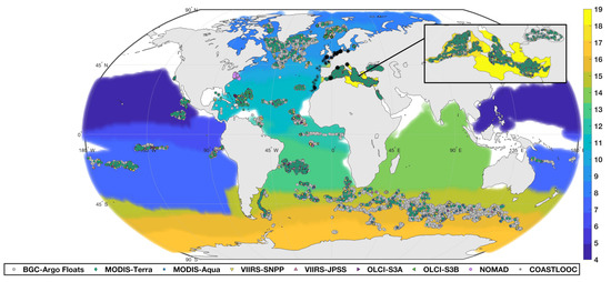 Map of Bio-Argo float observations and in situ observations used for algorithm development colored by matchups with individual satellite sensors or dataset. Background represents oceanic biomes 1–17 of [12]. Insert represent the Mediterranean Sea and the two biomes we added. The names associated with each biome number and color are listed in Table A2.