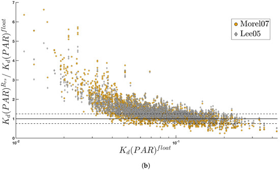 The number of matchups between sensors-derived and floats-derived Kd(PAR) was 832 for MODIS-Aqua, 944 for MODIS-Terra, 1402 for VIIRS-SNPP, 613 for VIIRS-JPSS, 155 for OLCI-S3A and 227 for OLCI-S3B (Figure 5) resulting in a total of 4173 matchups between float and satellite. For all sensors, there was an underestimation for small values: Kd(PAR)float < 0.038 m−1 for Kd(PAR)Morel and Kd(PAR)float < 0.048 m−1 for Kd(PAR)Lee05 representing 11% and 20% of the full dataset, respectively. For those values, independent of the sensors, Kd(PAR)float < Kd(PAR)Rrs, with the ratio increasing as Kd(PAR)float decreased (Figure 5b). The regression slopes are <1 for both algorithms, and there was a significant intercept for both of them (Table 5).