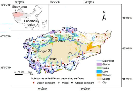 Study area. Location of representative sub-basins with different underlying surface conditions in the Tarim River basin. ①–⑦ refer to major rivers in the study area, correspondingly named Qarqan River, Tarim River, Kaidu River, Aksu River, Kashgar River, Yarkant River, and Hotan River.