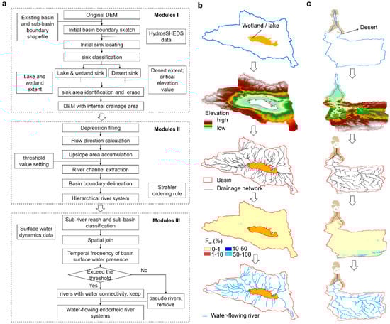 Identification of endorheic rivers. (a) The overall framework composed of three modules, i.e., introduction of internal drainage areas (Module I), extraction of river networks and delineation of basin boundaries (Module II), and identification of flowing rivers (Module III). (b,c) Separately represent two cases about the workflows on identification of endorheic rivers with a wet/lake sink and with a desert sink.
