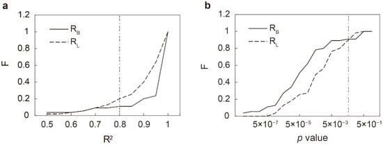 The Horton self-similarity test was made for each river network identified from 60 representative sub-basins in the Tarim Basin. Figure 3 shows the distribution of p values and coefficient of determination (R2). Based on the acceptance thresholds (R2 > 80% and ANOVA p values < 0.05) for Horton self-similarity assumption [47], 83% and 73% of examined sub-basins pass the test in terms of RB and RL, respectively, suggesting that most endorheic river systems in the Tarim Basin could be considered as self-similar statistically.