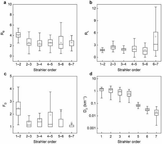 To detect hierarchal characteristics of endorheic river structure, Figure 4 displays variations of four typical structural parameters (RB, RL, FD, and DD) as functions of stream-orders for representative sub-basins in the Tarim River basin. Convergences of RB and RL generally happen to rivers at stream-orders 1–4 (Figure 4a,b). As the stream-order increases from 5 to 7, RB and RL exhibit increased uncertainty. DD remains stable with median values ranged 0.7~1.3 km−1 at stream-orders 1–4, showing a sharp drop at Strahler order 5, and decreasing significantly with stream-orders after (Figure 4d).