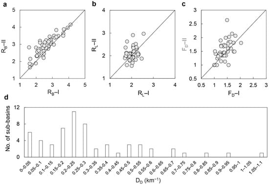 For endorheic rivers passed the Horton self-similarity test, we estimated the Horton ratios (RB, RL) and FD by regression method (I) and average method (II) and compared them by introducing a diagonal line representing ‘y = x’ (Figure 5a–c). These two methods should be equally effective as most plots are distributed around the diagonal lines, and thus the ranges of Horton values (RB ∈ [1.6, 4.2], RL ∈ [1.6, 3.0]) derived from the methods would not vary significantly, though both were lower than those typically observed in exohreic rivers [51], i.e., RB ∈ [3, 5], RL ∈ [1.5, 3.5]. Similarly, about 80% of concerned sub-basins show a smaller FD than that (1.6) are commonly observed in exohreic rivers [49,52].