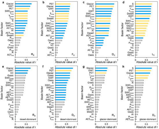 Correlation between structure parameters of endorheic rivers and basin factors. Spearman correlation coefficient (r) of: (a) bifurcation ratio (RB); (b) fractal dimension (FD); (c) drainage density (DD); (d) mean length of the rivers at stream-order 5 (L5) for the 60 sub-basins in the Tarim River basin. (e,f) are r values for desert-dominant sub-basins. (g,h) are the r values for glacier-dominant sub-basins. The blue and yellow histograms, respectively, represent significantly positive and negative correlations, whereas the white histogram represents no correlation observed.