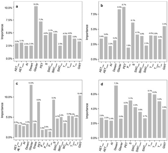 Relative contributions of basin factors to the differences in structural parameters for the 60 sub-basins in the Tarim River basin: (a) bifurcation ratio (RB); (b) fractal dimension (FD); (c) drainage density (DD); (d) mean length of the rivers at stream-order 5 (L5). The bar chart shows the variable importance, that is, the proportion of explained variability calculated via multiple regression modeling and variance decomposition analysis.