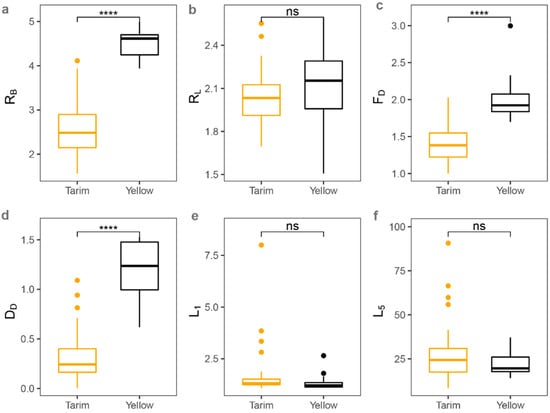 Comparison of structural parameters between the Tarim River and the Yellow River (ns, p > 0.05; **** p < 0.0001; Wilcoxon rank-sum test): (a) bifurcation ratio (RB); (b) channel length ratio (RL); (c) fractal dimension (FD); (d) drainage density (DD); (e) mean length of the rivers at stream-order 1 (L1); (f) mean length of the rivers at stream-order 5 (L5).