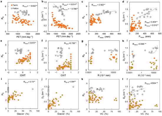 Relations between structural parameters (RB, DD) of river networks and basin factors including (a,b) PET, (c,d) Pmean, (e,f) GWT, (g,h) R, (i,j) Glacier, and (k,l) VC for representative sub-basins in the Tarim (orange dot) and the Yellow River basins (black hollow dot) (** p < 0.01; Spearman correlation).