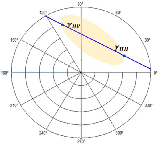 where is the complex unitary projection vector, and are the Pauli vectors corresponding to the two polarimetric images, denotes the transposed conjugate operator, and is the selected phase, which changes between 0 and . For each pixel, all parameters in Equation (4) are fixed except , which changes between 0 and . In other words, for each change of angle in Equation (4), with a specified step (e.g., ) and in the range from 0 to 180, two points are obtained from the coherence region.