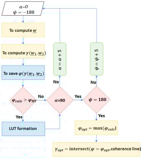 where and are the complex unitary projection vectors, and are the Pauli vectors corresponding to the two polarimetric images, refers to the complex coherence in the selected polarization basis and finally, and denotes the transpose operator. According to the parametrization of the , all possible complex coherences are calculated and a look-up table is formed based on a simple condition as follows.