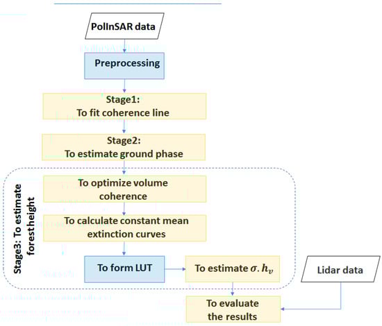 The flowchart of the proposed algorithm for forest height estimation based on the dual PolInSAR data.