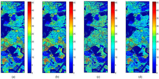 It has been found that branch orientation and size have a critical effect on the volume-only channel backscattering. Branch parameters are in turn strongly dependent on species, so a dependence of species on the backscattering would be expected. For this reason, forest height estimation is generally performed in stands that are as pure as possible in terms of species type [26]. Figure 9 shows the pixel-wise height estimation results by performing the coherence model inversion exclusively from dual PolInSAR data without ground information. It is worth stressing that all the inversion methods were performed on the pixels with a height more than 10 m. As shown in Figure 9, the upper limit of the height range in the conventional three-stage method is higher than the corresponding limit in the Lidar measurement. However, according to Figure 9, the overall pattern in the pixel-wise height map for all three estimation methods is consistent with that obtained from the Lidar measurement.
