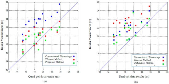 The improvement of the forest height estimation using the proposed method is clearly demonstrated in Table 2. As shown in Table 2, the RMSE for all 15 stands decreases more than 2 m using the proposed method in both the quad and dual PolInSAR data. Additionally, the proposed method is more accurate compared to the Wenxue three-stage algorithm. This is mainly because the proposed method investigates all polarization bases to find the most dependable volume-only coherence and since the third stage of the three-stage method is performed based on the optimal volume coherence. However, the Wenxue method calculates the volume-only coherence based on the least-squared method according to Equation (2) and only for two observed polarization bases.