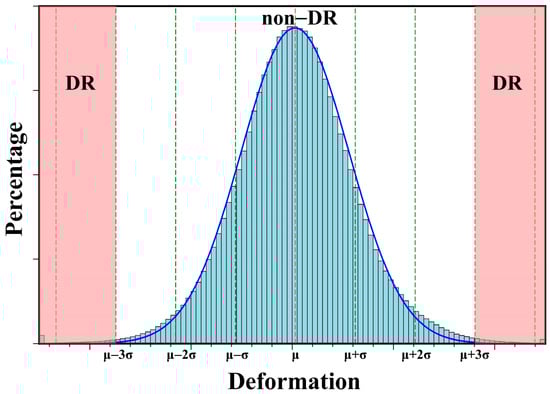 According to the central limit theorem, the distribution of a large number of random variables is close to the normal distribution. Based on the assumption of normal distribution, deformation regions and non-deformation regions are extracted from the statistical indicators (mean and standard deviation; μ and σ, respectively) of three deformation maps. Assuming that an area without any deformation, the results of surface deformation obtained by InSAR should obey the distribution of N(0,σ). Due to the existence of a series of noise reduction methods and random noise phases, the actual obtained distribution is close to the normal distribution (N(μ,σ)). For the normal distribution, the random variables distributed in the range of μ ± 3σ account for 99.74%. After calculating μ and σ of the deformation map according to this theory, the results outside the range of μ ± 3σ are categorized as deformation regions (DR), and the results within the range of μ ± 3σ are categorized as non-deformation regions (non-DR). The deformation regions map is obtained, as well as the distribution histogram of deformation results and its fitting normal distribution curve, as shown in Figure 2.