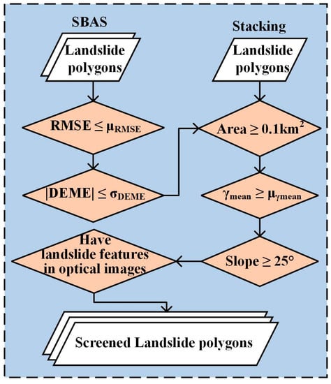 where γk is the coherence map of each interferogram pair, and m is the number of interferograms. DEME and RMSE are the results generated by the SBAS program encapsulated by GMTSAR software. According to the statistics [56], landslides mostly develop on terrain slopes in the range of 25° to 45°. The slope threshold of landslide polygons is set to 25°, and the average slope value is calculated based on DEM data. The area threshold is set to 0.1 km2 to screen landslide polygons larger than medium size. For each landslide polygon obtained based on SBAS-InSAR data, the μ and σ of the five indicators are calculated and used as thresholds to screen all landslide polygons. For landslide polygons obtained by stacking-InSAR, because there is no DEME and RMSE, only three indicators are used for screening: γmean, area, and slope. To avoid missing dangerous landslides, the landslide polygons with maximum deformation values outside the range of μ ± 6σ are also screened.