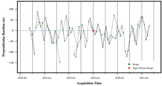 Sentinel-1 images and the corresponding precise orbit determination ephemeris files were obtained from the European Space Agency (ESA) website. The data acquisition period was from September 2018 to February 2021, with 76 scenes in total. Details of used data and relevant processing parameters are presented in Table 1, and the combinations of interferogram pairs are shown in Figure 8. The cropped DEM data of the research area were obtained from the official website of GMTSAR software, with a 1 s arc resolution corresponding to 30 m ground resolution.