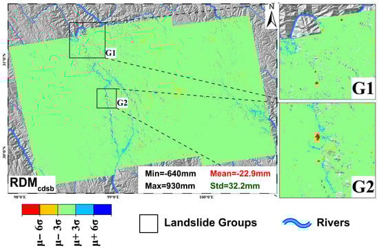 Here, μ ± 6σ is set as the threshold of deformation gradation [61]; max refers to the maximum value for the positive value of LOS direction and the minimum value for the negative value of LOS direction. The gradation result of each landslide (Equation (5)) is obtained by superimposing graded labels corresponding to three deformation maps.