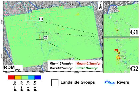 Using the SBAS-InSAR and stacking-InSAR methods, three deformation maps were obtained from the ascending data in the study area, as shown in Figure 9, Figure 10 and Figure 11. Combining the three results revealed two obvious landslide groups: G1 and G2; landslide group G1 comprises four landslides, including the Baige landslide, and landslide group G2 comprises several landslides, including the Xiongba ancient landslide. These results are consistent with previous studies [18,38,39]. The distribution histograms of the three deformation maps were generated (Figure 12), and the normal distribution curves were fitted according to the μ and σ of the three results. The fitted normal distribution curves of the three results are in agreement with the distribution histogram.