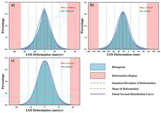 Distribution histogram of three deformation maps and its fitted normal distribution curve. (a) Annual velocity map obtained by SBAS. (b) Time-series cumulative displacement map obtained by SBAS. (c) Annual velocity map obtained by stacking.