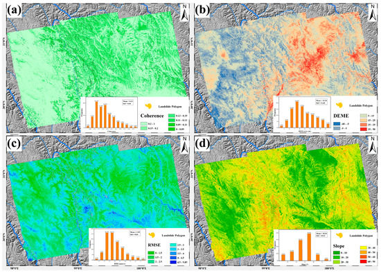 Landslide polygon statistics. (a) γmean with its landslide polygons statistic. (b) DEME with its landslide polygons statistic. (c) RMSE with its landslide polygons statistic. (d) Slope with its landslide polygons statistic.
