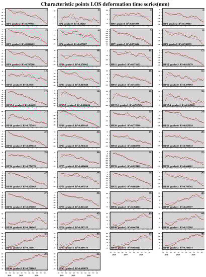 To validate the LGM proposed in this paper, feature points were selected among the 47 identified landslides, among which four feature points of landslide #17 were selected. Using the time-series cumulative displacement results obtained by SBAS-InSAR, the deformation on the time series of each feature point was extracted, as shown in Figure 17. The distribution of these 50 feature points is shown in Figure 18. According to the principle of least squares, the linear deformation velocity of each feature point was fitted, and the correlation coefficient (R2) between the fitted linear deformation velocity and the time series deformation was calculated. The R2 under different grades was quantified, and the statistical results are shown in Table 3. With increased deformation grade, the R2 of each landslide feature point increased significantly, indicating that the R2 is obviously positively correlated with the landslide grade. Furthermore, the R2 of the feature points can reflect the linear deformation trend of the landslide point. The larger the deformation degree and the stronger the linear deformation trend, the more urgent the need for landslide monitoring. The proposed LGM can provide a distinction basis for the monitoring of landslides in large areas.