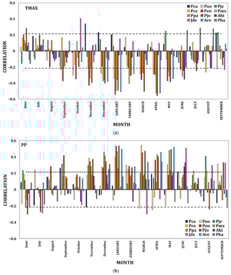 Pearson correlation analysis was conducted in order to evaluate the responses of wood growth to the climatic variables, relating the residual chronologies to the monthly variables of precipitation (PP) and maximum (TMax) and minimum (Tmin) temperature. The climatological data of these sites were obtained from the Climate Explorer website https://climexp.knmi.nl/start.cgi accessed on 13 December 2021 [43] and extracted at a resolution of 0.5° from the database CRU TS v. 4.04 [44].