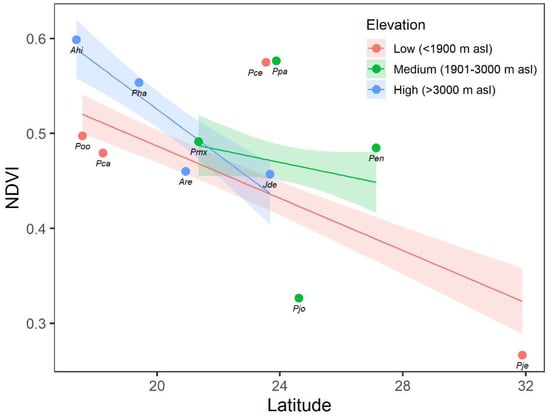 Linear relationship between the normalized difference vegetation index (NDVI) and latitude using data collected from different conifer species across the Mexican territory in the following elevation classes: low (<1900 m asl; red points and lines), intermediate (1901–3000 m asl; green points and lines), and high (>3000 m asl; blue points and lines). Points indicate the observed annual mean NDVI in each species for the period 2000–2020. Lines and shaded regions represent the predicted values and the 95% confidence band from the linear fit, respectively.