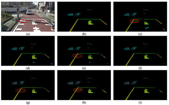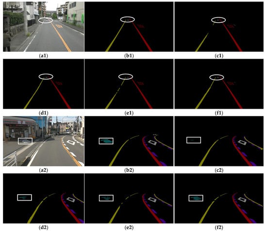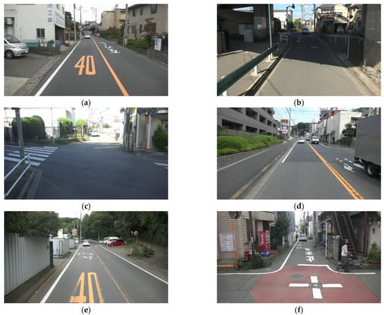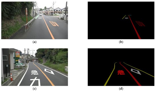 A graphical image-annotation tool called Labelme [] was used to manually annotate the raw images. Both symbolic road markings and road lanes were manually annotated as polygons with corresponding shapes. After annotation, pixel-level segmentation masks were converted from the generated JSON format data. Examples of RMDs are shown in Figure 3. It should be noted that, when annotating road markings consisting of multiple Japanese characters, only the key characters were annotated, as shown in Figure 3d.