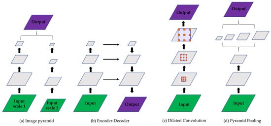 The problem of multiple-scale objects is prevalent in the proposed RMD. Due to the size and location of road markings, the pixels occupied by each instance are different. As shown in Figure 1e, the number of pixels occupied by the road marking of maximum speed limit 40 on the left side of the road is significantly greater than that on the right side of the road, although they are the same object. Chen et al. [] specify this problem as the existence of objects at multiple scales, which is a main difficulty for the task of semantic segmentation. To handle the problem, a wide range of methods have been proposed [,,,], which can be summarized into the following four types of network architectures, shown in Figure 2 [].